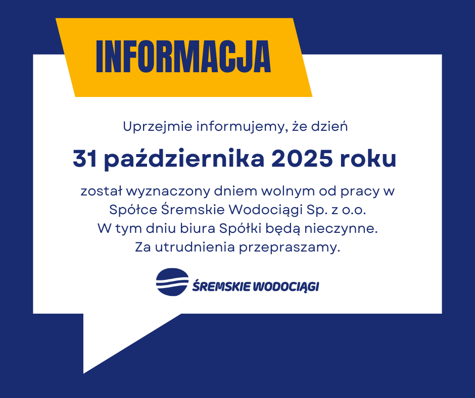 Informujemy, że w dniach od 20 do 30 października 2025 roku w prawobrzeżnej części Śremu nastąpi wymiana wodomierzy głównych, w związku z upływem terminu ich legalizacji.