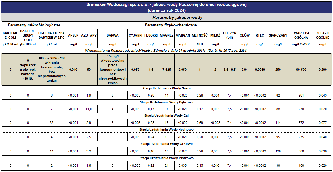 Aby zapobiegać pogarszaniu się jakości wody Śremskie Wodociągi wymieniają stare oraz systematycznie płuczą i dezynfekują rurociągi, ze szczególnym uwzględnieniem końcówek sieci, gdzie woda przebywa najdłużej, co może wpływać na pogorszenie jej jakości i powodować tzw. wtórne zanieczyszczenie. Woda poddawana jest systematycznym analizom w Laboratorium badania wody. Jest również kontrolowana przez Powiatową Stację Sanitarno – Epidemiologiczną. Zgodność z wymaganiami obowiązującego rozporządzenia Ministra Zdrowia w sprawie jakości wody przeznaczonej do spożycia przez ludzi obrazuje tabela.