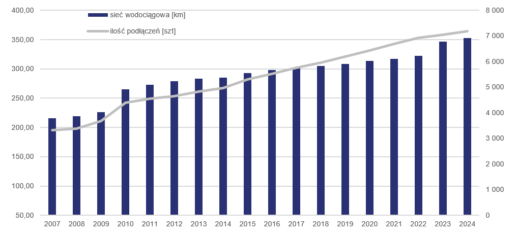 Poniższy wykres prezentuje dynamikę przyrostu długości sieci wodociągowej oraz wzrost ilości liczby podłączeń wodociągowych w latach 2007 – 2024.